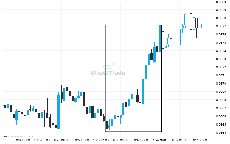 ETHBTC has moved higher by 3.48% from 0.03646 to 0.03773 in the last 20 hours.