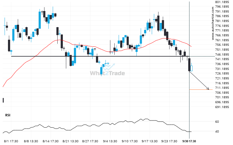 META has breached the support line at 743.9550. It may continue the bearish trend towards 708.9245, or, it may prove to be yet another test of this level.