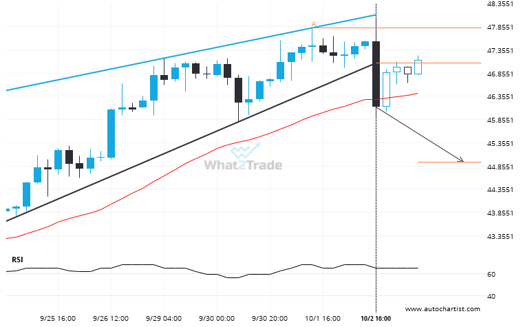 This trade setup on Silver Spot is formed by a period of consolidation; a period in which the price primarily moves sideways before choosing a new direction for the longer term. Because of the bearish breakout through support, it seems to suggest that we could see the next price move to 44.9414.