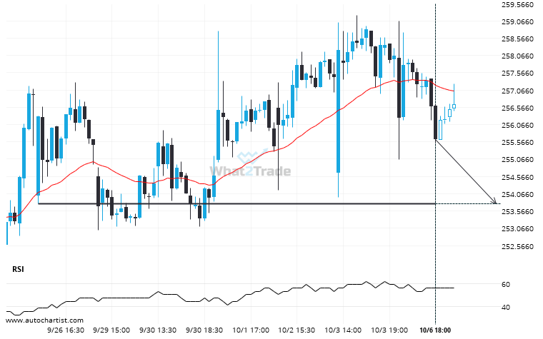 AAPL is approaching a support line at 253.7800. If it hits the support line, it may break through this level to continue the bearish trend, or it may turn around back to current levels.