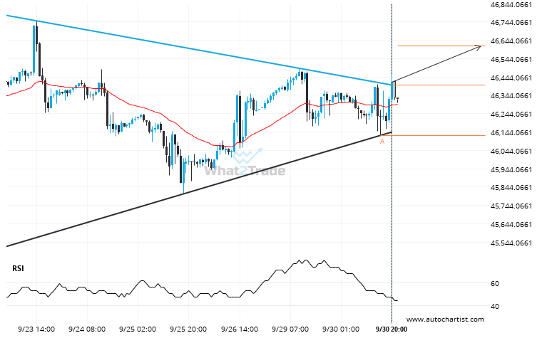 DOW 30 has broken through a resistance line of a Triangle and suggests a possible movement to 46612.9534 within the next 2 days. It has tested this line in the past, so one should probably wait for a confirmation of this breakout before taking action. If the breakout doesn’t confirm, we could see a retracement back to lines seen in the last 9 days.
