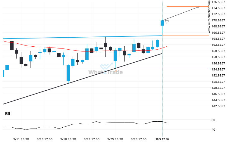 The breakout of AMD through the resistance line of a Ascending Triangle could be a sign of the road ahead. If this breakout persists, we may see the price of AMD testing 174.9580 within the next 2 days.