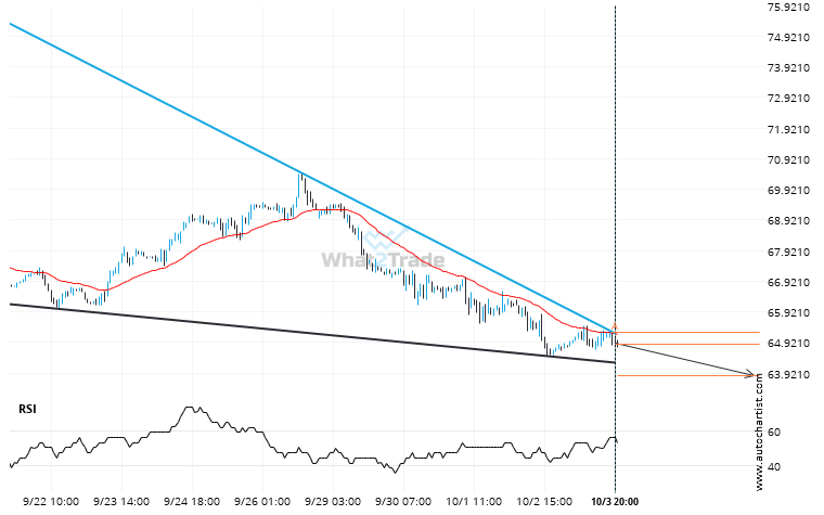Emerging Falling Wedge detected on Brent Crude – the pattern is an emerging one and has not yet broken through resistance, but the price is expected to move up over the next few hours. The price at the time the pattern was found was 64.8755 and it is expected to move to 63.8276.