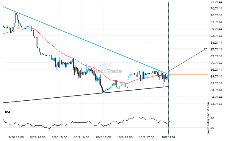 Triangle pattern identified on Brent Crude has broken through a resistance level with the price momentum continuing to move in an upward direction. A solid trading opportunity continues with the price expected to reach 67.7624 in the next 3.
