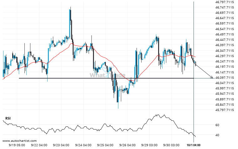 DOW 30 is heading towards a line of 46089.0000. If this movement continues, the price of DOW 30 could test 46089.0000 within the next 2 days. But don’t be so quick to trade, it has tested this line numerous times in the past, so this movement could be short-lived and end up rebounding.