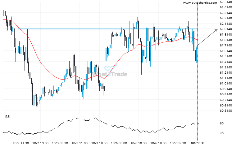 US Oil is moving towards a key resistance level at 62.0110. This is a previously tested level for US Oil. This could be a good trading opportunity, either at the spot price, or after breaching this level.