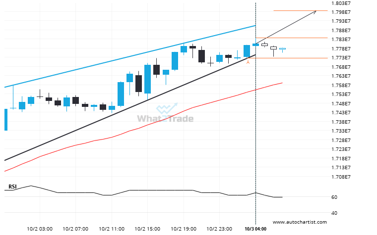 BTCJPY is moving towards a resistance line. Because we have seen it retrace from this line before, we could see either a break through this line, or a rebound back to current levels. It has touched this line numerous times in the last 2 days and may test it again within the next 5 hours.