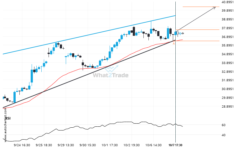 Emerging Rising Wedge pattern in its final wave was identified on the INTC 1 hour chart. After a strong bullish run, we find INTC heading towards the upper triangle line with a possible resistance at 40.3093. If the resistance shows to hold, the Rising Wedge pattern suggests a rebound back towards current levels.