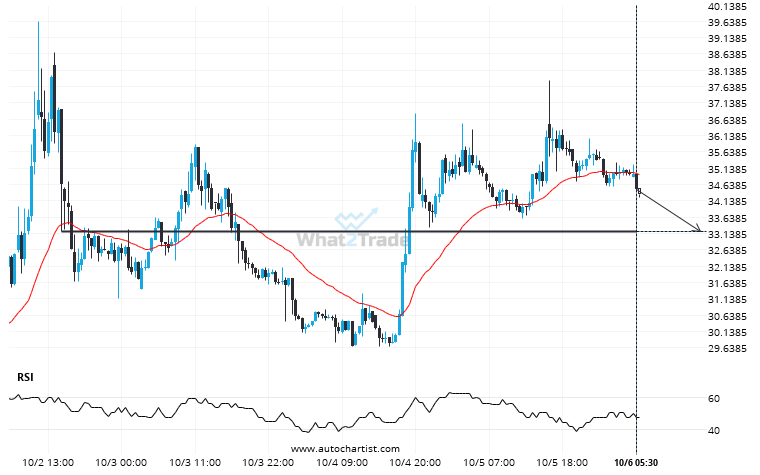 DASHUSD is heading towards 33.2000 and could reach this point within the next 20 hours. It has tested this line numerous times in the past, and this time could be no different, ending in a rebound instead of a breakout. If the breakout doesn’t happen, we could see a retracement back down to current levels.