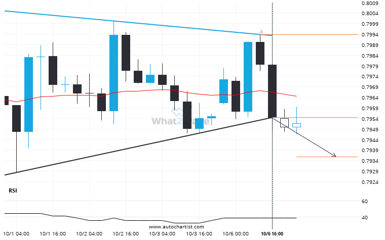 USDCHF has broken through a support line. It has touched this line at least twice in the last 12 days. This breakout may indicate a potential move to 0.7936 within the next 18 hours. Because we have seen it retrace from this position in the past, one should wait for confirmation of the breakout before trading.